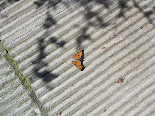 Εκεί, δεκάδες πεταλούδες, πετούσαν τριγύρω, αλλά δυστυχώς δεν κατάφερα να τις φωτογραφίσω όλες από κοντινή απόσταση, ενώ άλλες απογειώνονταν αμέσως μόλις τις πλησίαζα...Αλλά βεβαίως η δουλειά τους δεν ήταν να μου ποζάρουν, κι εγώ φυσικά αν ήθελα /ή αν μπορούσα να διαθέσω τον χρόνο που χρειάζεται για να τραβήξω καλές κοντινές φωτό, θα έπρεπε να είμαι κατάλληλα προετοιμασμένη, όπως πχ, να έχω καλύτερη και μεγαλύτερη φωτογραφική μηχανή, με τηλεφακούς και τρίποδα (που δεν έχω). Η πεταλούδα των δύο παραπάνω φωτό, όταν πετούσε, έμοιαζε με πορτοκαλιά φλόγα που μεταπηδούσε από λουλούδι σε λουλούδι, με μεγάλη ταχύτητα...Τελικά, την πέτυχα με διπλωμένα τα φτερά- δεν ήθελα να τη διώξω από το φυτό που είχε καθήσει, επειδή εντωμεταξύ ψιλόβρεχε και εκεί ήταν σχετικά ασφαλής από την βροχή, οπότε αρκέστηκα στην εξωτερική πλευρά των πορτοκαλιών της φτερών- κάτι είναι κι αυτο!