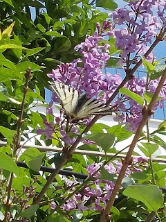 Φέτος λοιπόν, είδα μόνον ένα ζευγάρι Μαχάωνες, αλλά εντόπισα άπειρους Ποδαλείριους, ακόμα και μέσα στο κέντρο της πόλης, στις 2 φωτό που ακολουθούν, μια πεταλούδα του είδους, τρέφεται πάνω σε μια πασχαλιά στην γειτονιά μου...