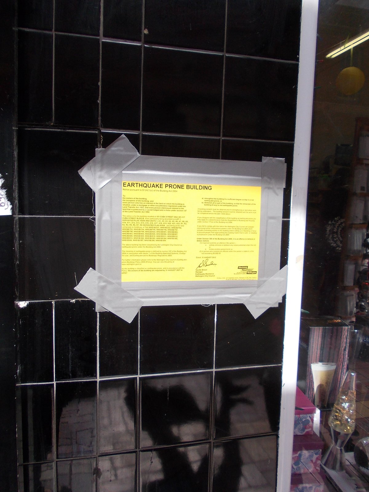 Αντί όμως να σας βάλω φωτό από την βόλτα μας στις ανατολικές ακτές του κόλπου του Ουέλλιγκτον, προτίμησα να σας δείξω φωτό από το κέντρο...Βλέπετε τις τελευταίες μέρες γίνεται πολύς λόγος για την κατάσταση των κτιρίων της πόλης (ορισμένα είναι σκέτα ερείπια) καθώς και τις πιθανές ζημιές που θα προκληθούν από έναν ενδεχόμενο -μεγάλο- σεισμό, (σε βάζει σε σκέψη πάντως η τόση πρεμούρα, αναρωτιέσαι αν συμβαίνει κάτι που δεν σου λένε), κι ενώ λοιπόν όλα τα ΜΜΕ αναπαρήγαγαν τις εκτιμήσεις των επιστημόνων, στα κτίρια του κέντρου τοιχοκολλούνται κίτρινες ειδοποιήσεις, σχετικές με την επικινδυνότητα των κτιρίων!