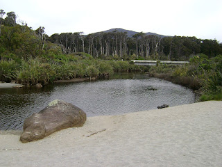 Το ρεματάκι από το οποίο πήρε το όνομά της η ακτή, στο βάθος η γέφυρα της Εθνικής και το γειτονικό δάσος rimu (Dacrydium cupressinum)...