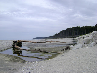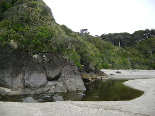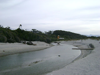 H δασωμένη ακτή και η εκβολή του ρέματος στην θάλασσα, ενώ τεράστιοι κορμοί rimu είναι ξεβρασμένοι και μισαθαμμένοι στην άμμο...Για καλή μας τύχη, την ώρα που είμασταν εκεί και αγναντεύαμε τη θάλασσα, 2 δελφίνια του σπανιότατου είδους Hector, πέρασαν πολύ κοντά στην παραλία, τα αναγνωρίσαμε και τα τραβήξαμε και βίντεο :) http://en.wikipedia.org/wiki/Hector's_dolphin