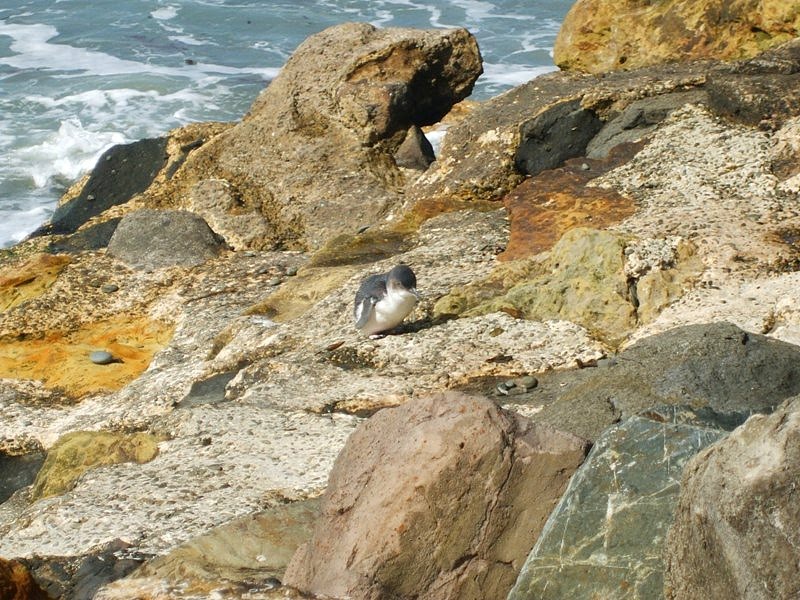 Για καλή μας τύχη, στην πέτρινη ακτή μπροστά από την αποικία, είδαμε ένα νεαρό μπλε πιγκουίνο που είχε ξεμείνει σε βατό και ασφαλές σημείο ανάμεσα στους βράχους...Οι εργαζόμενοι στις εγκαταστάσεις γνώριζαν οτι βρισκόταν εκεί, και τον ελέγχανε συχνά: Θα ανέβαινε προς τις φωλιές όταν θα νύχτωνε, και μέχρι εκείνη την ώρα, θα έμενε στην ακτή...